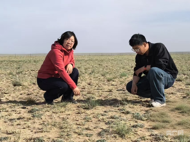 商都县科技特派团团长殷国梅(左一)和帮扶成员一起查看天然草场生长情况(央广网发 受访者供图)