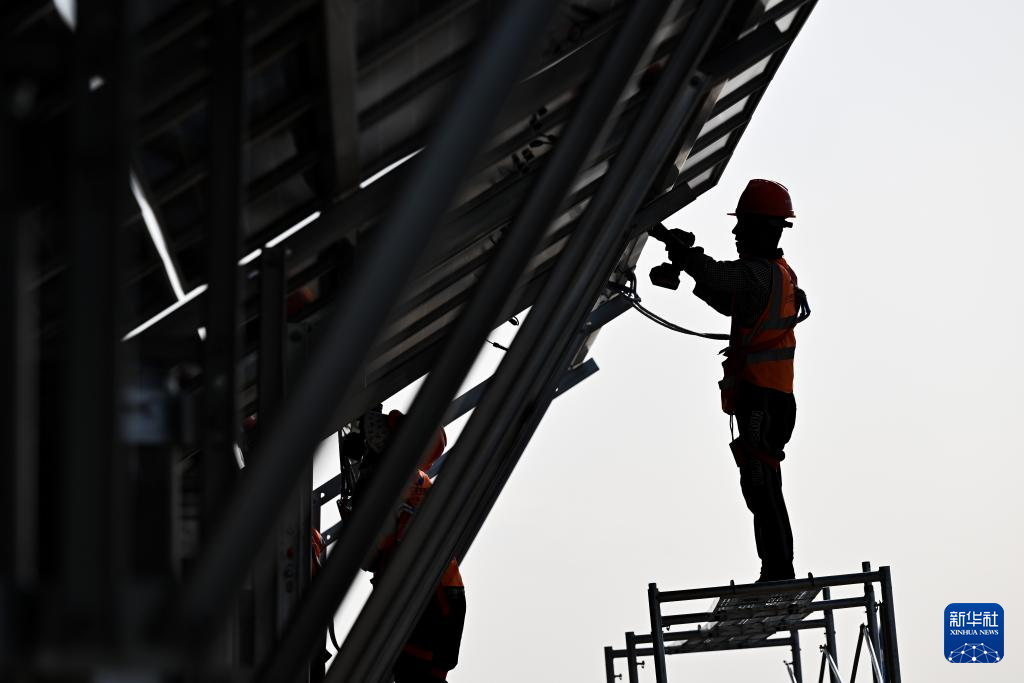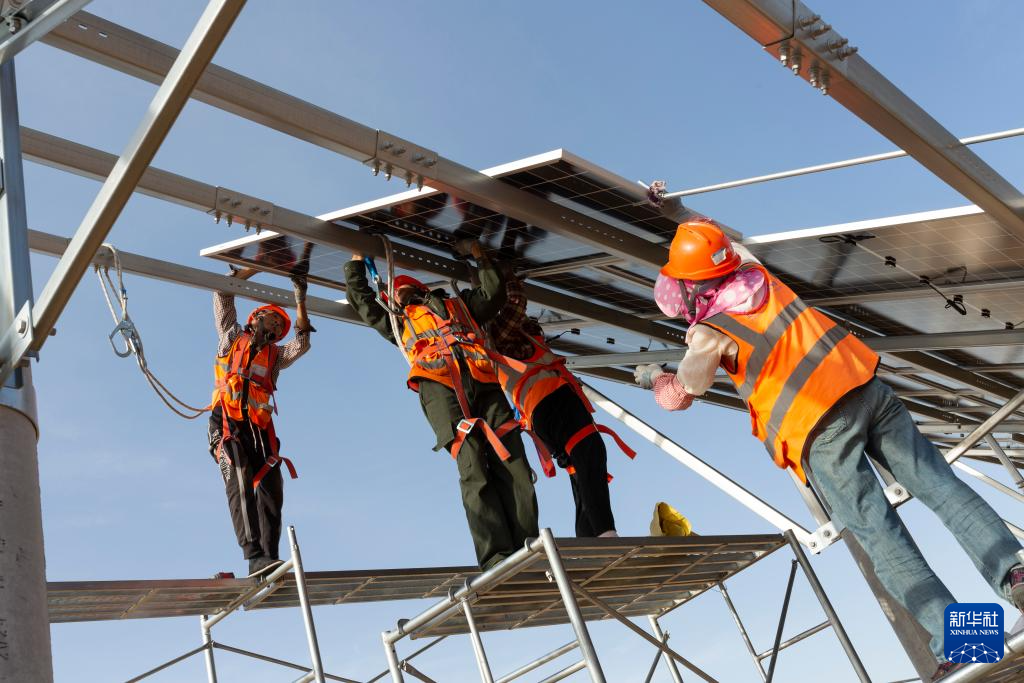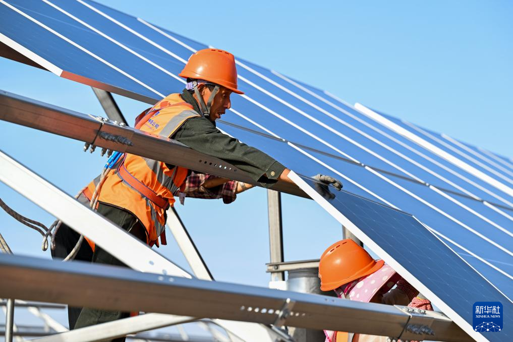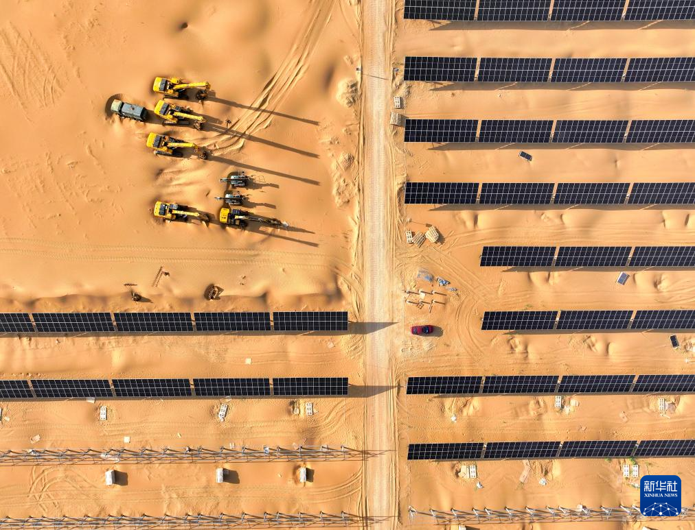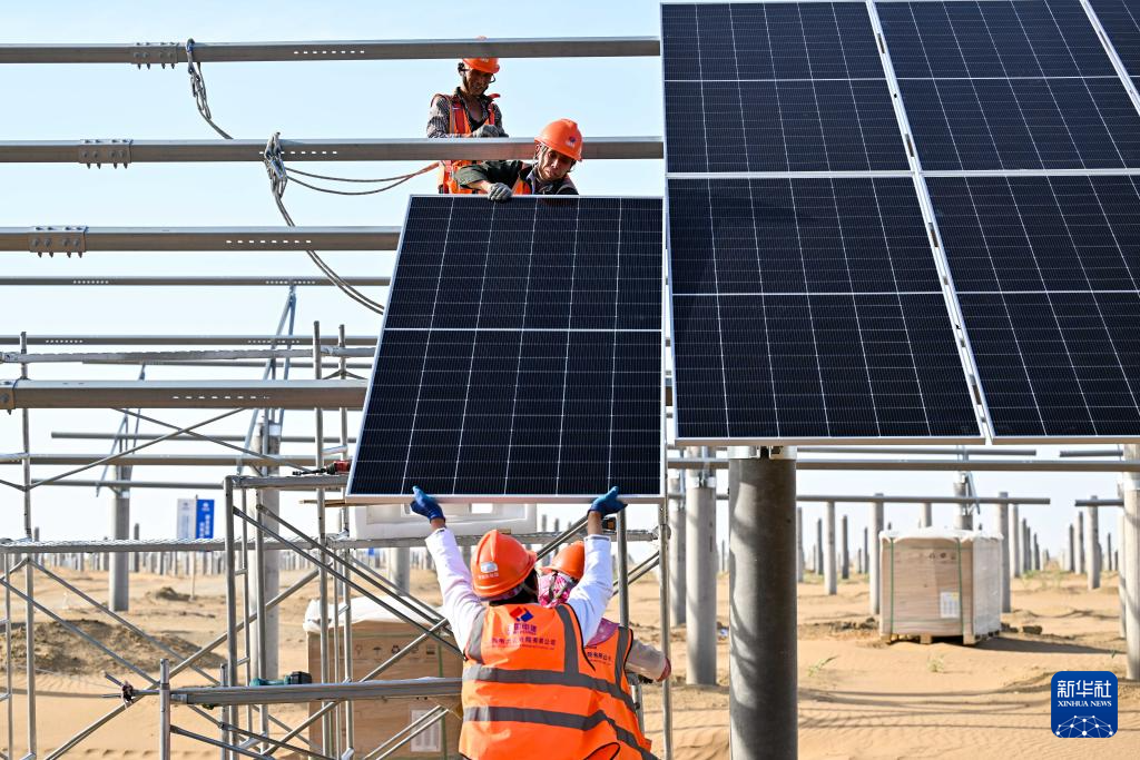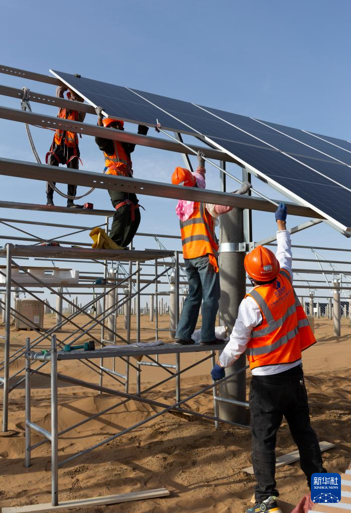 6月6日,在库布其沙漠里的鄂尔多斯市杭锦旗朔方新能源大基地,工人在安装光伏板。