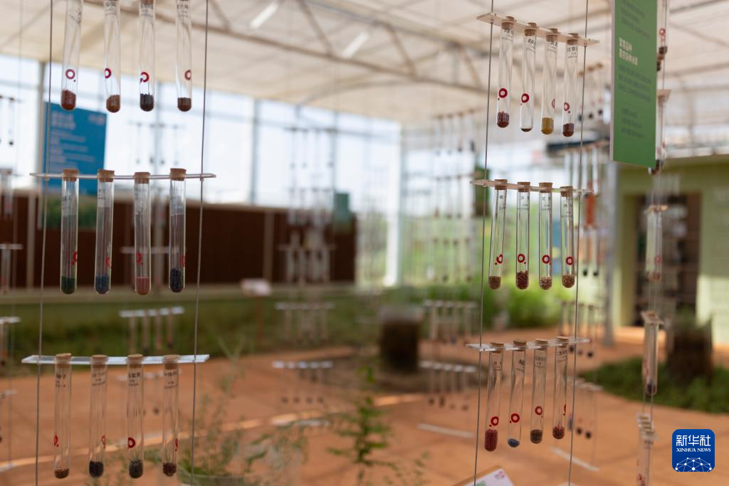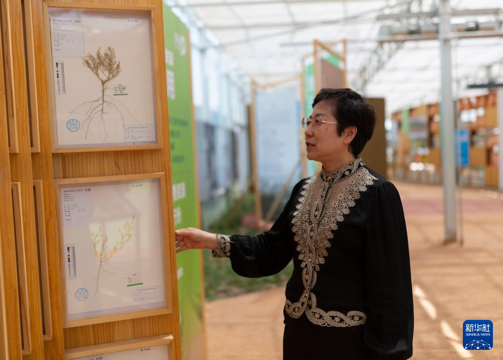 6月5日,工作人员在位于巴彦淖尔市临河区的国营新华林场防沙治沙和光伏一体化智慧指挥中心介绍沙生植物标本。国营新华林场防沙治沙和光伏一体化项目地处乌兰布和沙漠边缘。