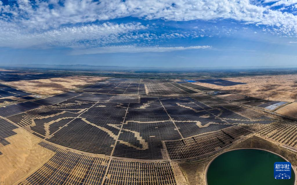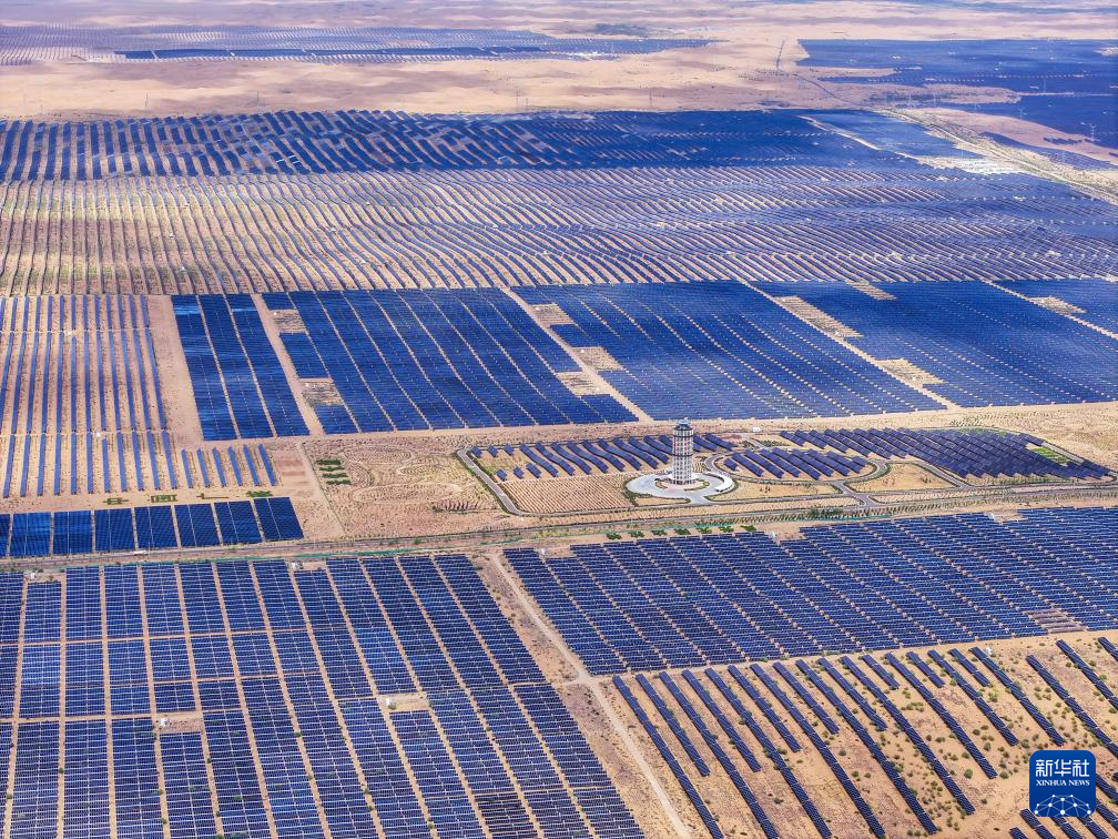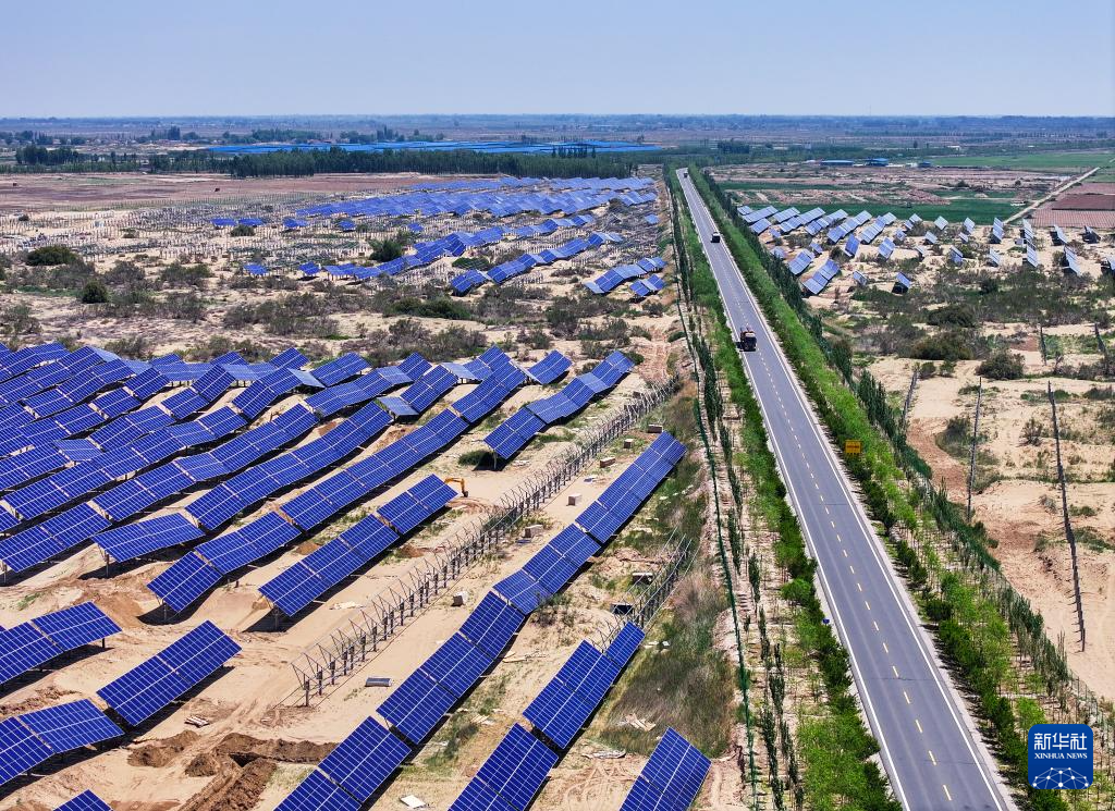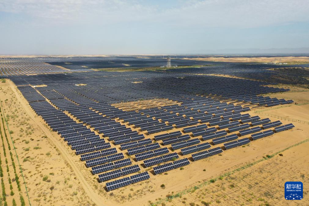 这是6月5日拍摄的位于巴彦淖尔市磴口县的乌兰布和东北部新能源基地100万千瓦光伏先导工程项目,该项目地处乌兰布和沙漠(无人机照片)。
