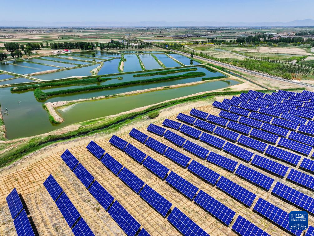 这是6月5日拍摄的位于巴彦淖尔市临河区的国营新华林场防沙治沙和光伏一体化项目,该项目地处乌兰布和沙漠边缘(无人机照片)。