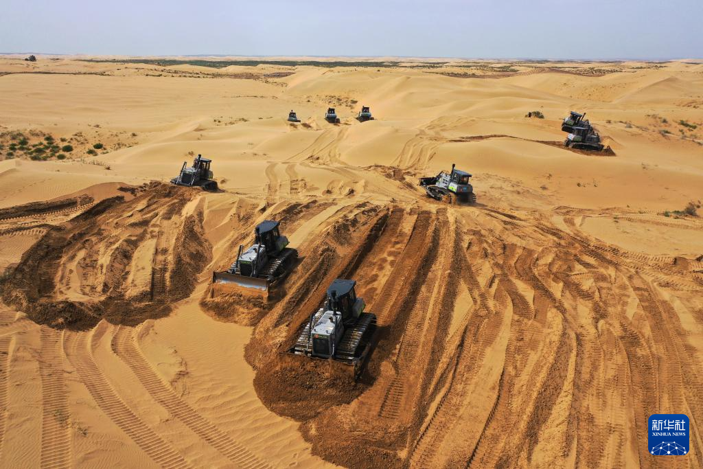 6月7日,在鄂尔多斯市达拉特旗境内的库布其沙漠,工程机械在平整沙地、开展光伏治沙工程建设(无人机照片)。