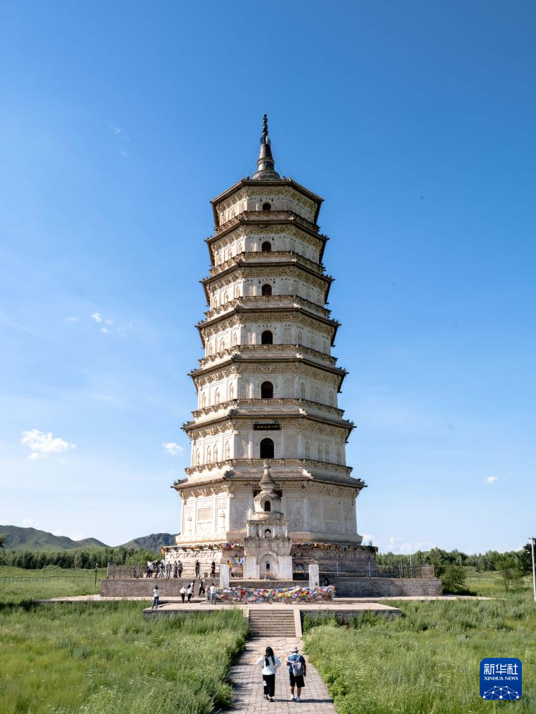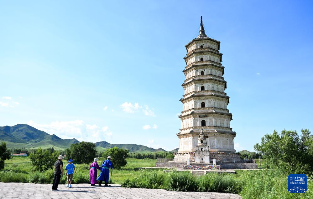 7月21日,游客在内蒙古赤峰市巴林右旗辽庆州白塔游览参观。