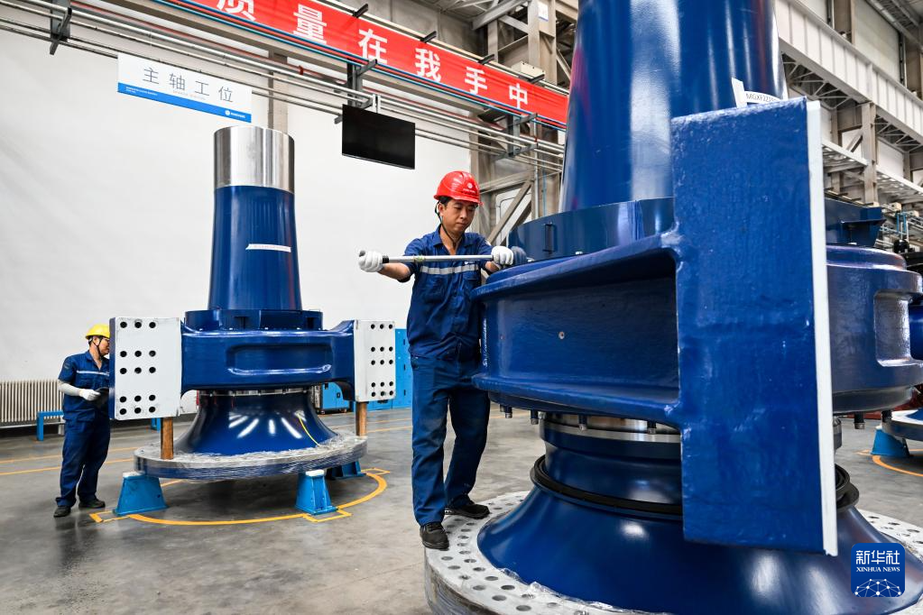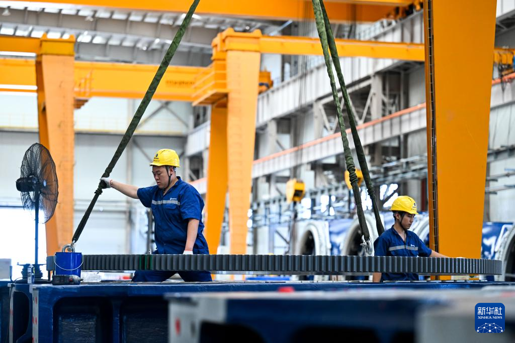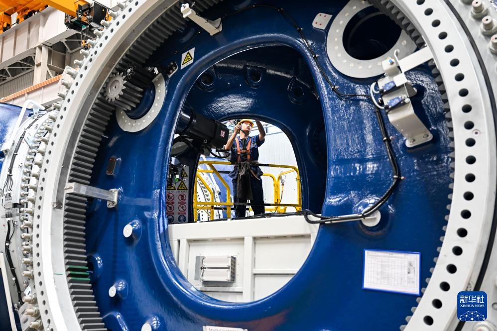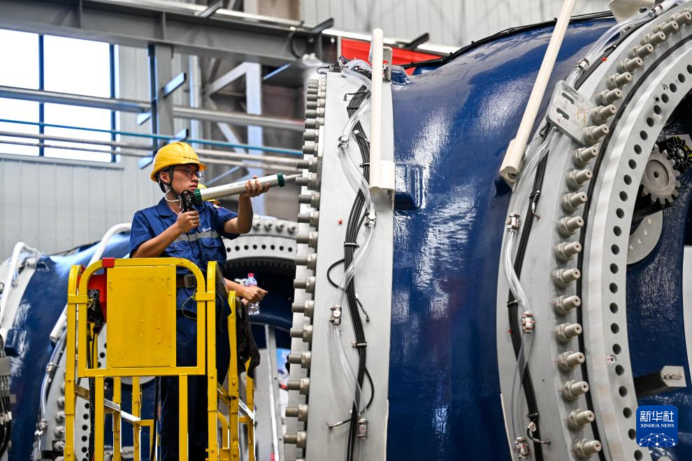 7月29日,工人在包头市明阳新能源智能制造产业园内查看风机组件情况。