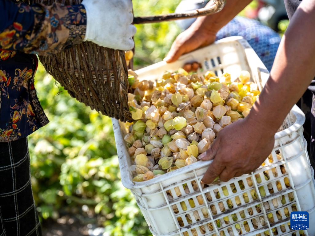 8月24日,在内蒙古呼伦贝尔市莫力达瓦达斡尔族自治旗尼尔基镇乌尔科村,村民将采摘的黄菇娘果装箱。