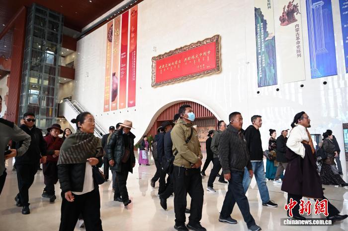 10月12日,内蒙古呼和浩特市,海外归国定居藏胞在内蒙古博物院参观。当日,“侨连五洲·海外归国定居藏胞代表人士国情教育活动”在呼和浩特进入第一天行程。40余位海外归国定居藏胞代表,接下来将用近一周时间,在呼和浩特、包头、鄂尔多斯3地,直观了解内蒙古的人文历史、生态建设与现代产业等方面内容。中新社记者刘文华 摄