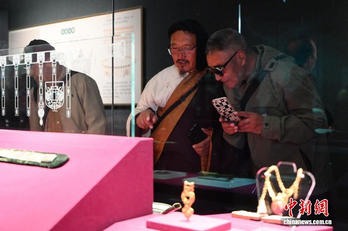 10月12日,内蒙古呼和浩特市,海外归国定居藏胞在内蒙古博物院参观辽代金饰。当日,“侨连五洲·海外归国定居藏胞代表人士国情教育活动”在呼和浩特进入第一天行程。40余位海外归国定居藏胞代表,接下来将用近一周时间,在呼和浩特、包头、鄂尔多斯3地,直观了解内蒙古的人文历史、生态建设与现代产业等方面内容。中新社记者刘文华 摄