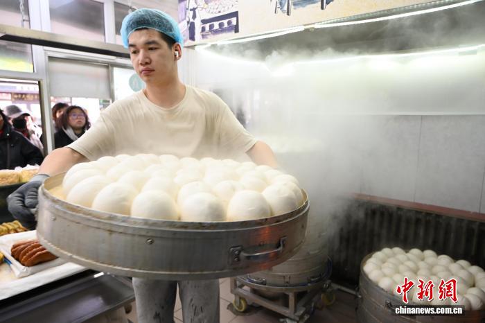 “三子呛面馒头”店门口,层层叠叠的笼屉腾起白雾。店主马慧萍一边招呼排队的顾客,一边麻利打包。对于这条老街上的商户,春节前这段时间,是一年里最金贵的日子。