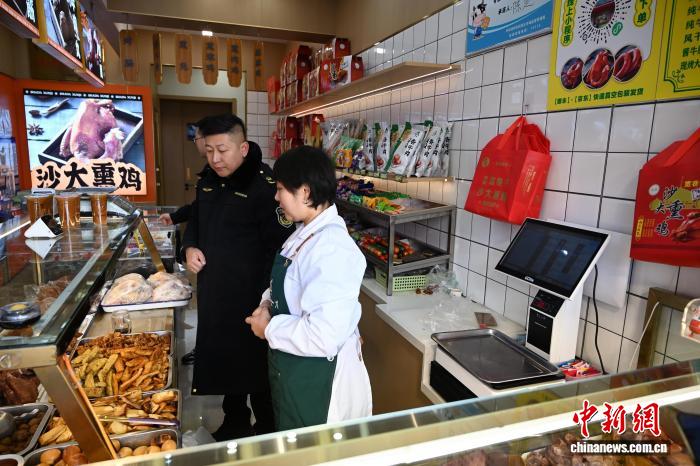 呼和浩特市宽巷子“沙大熏鸡”店,市场监管工作人员进行日常执法。中新网记者 刘文华 摄