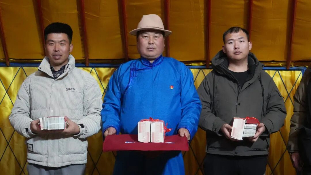 仪式现场,工作人员忙碌着核对牧户信息及分红金额,排队等候的乡亲们眼中满是期待。随后,合作社代表和牧民代表依次上台领取分红款,夕阳映衬着大家脸上的笑容和眼底的喜悦,瞬间定格为寒冬里最动人、最温暖的增收图景。