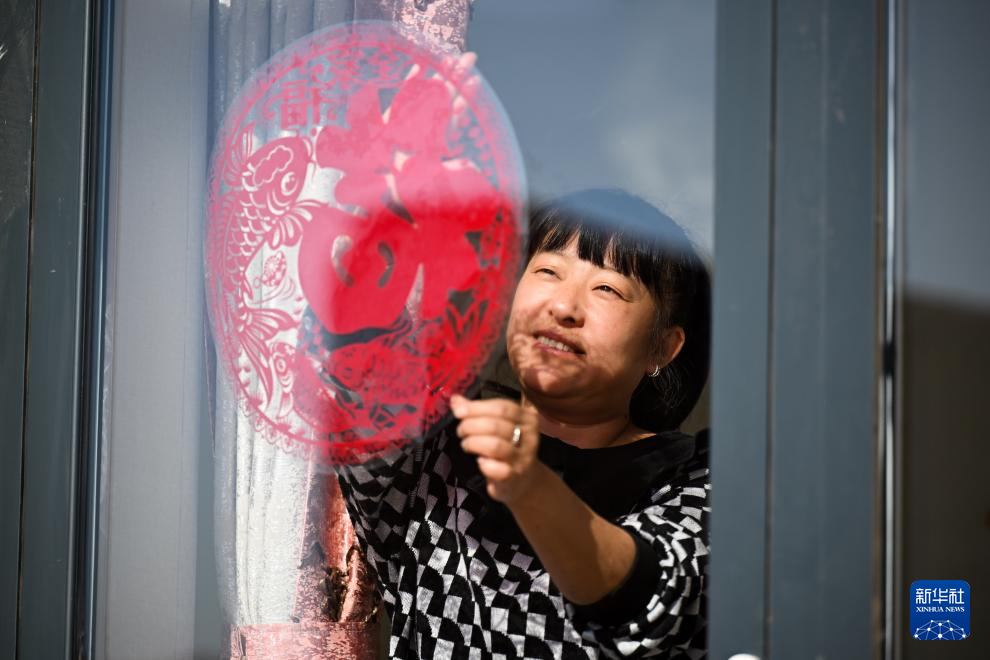 2月12日,村民张瑞军的妻子武红利在家中贴窗花。