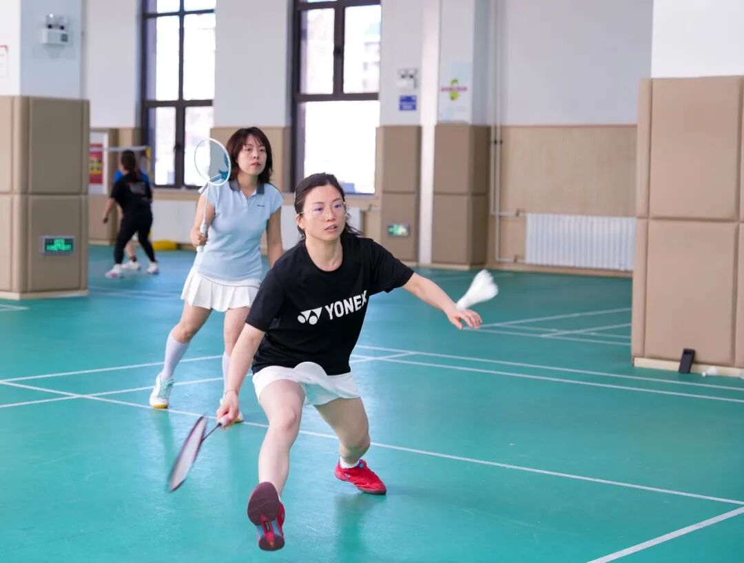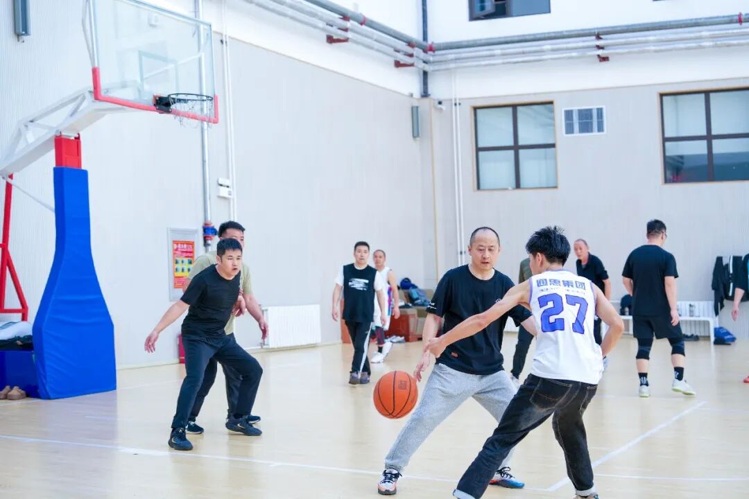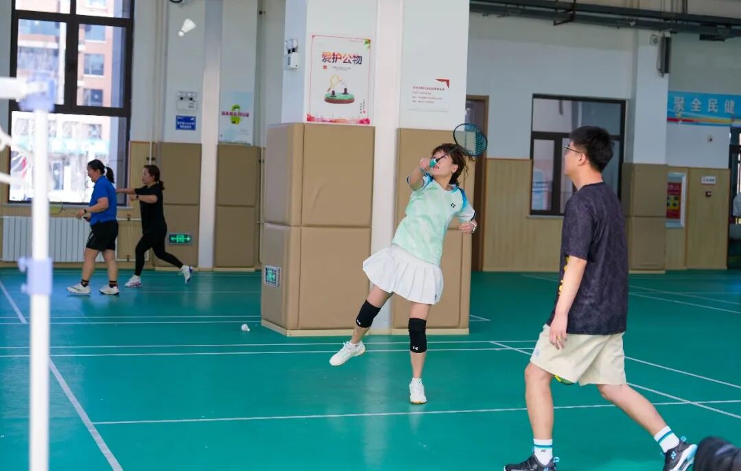 穿过门厅,运动区里很热闹。羽毛球场上,球在空中来回飞,接球者侧身后退,击球者踮脚扣杀,一来一往舒展筋骨。篮球场上,一群人正打得激烈,运球、突破、投篮,一记三分命中,击掌和叫好声回荡在场地里。