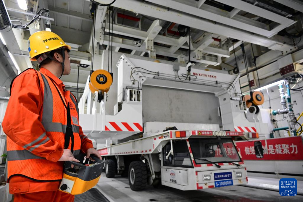 2月19日,青岛胶州湾第二隧道工程南线主隧道盾构段,一名建设者在操控箱涵吊运。