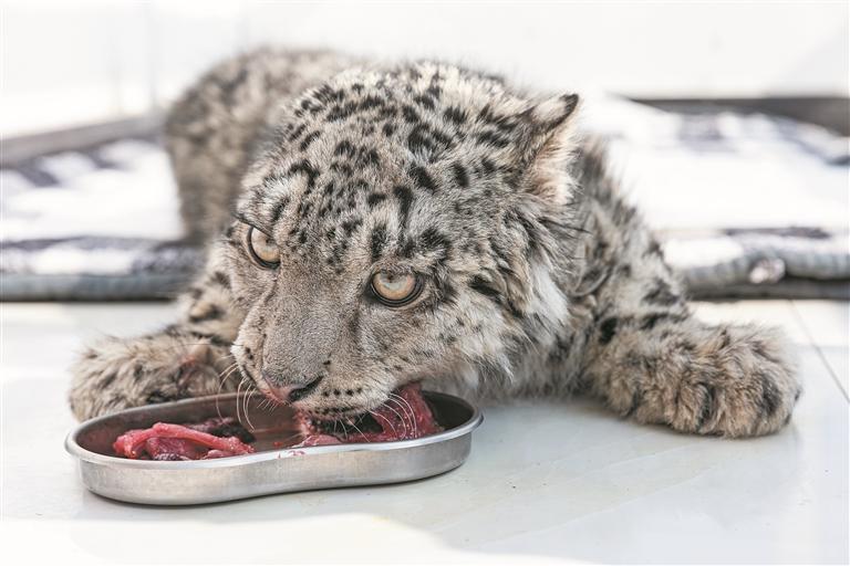 这只每天对着镜头认真吃饭、翻身打滚的小雪豹从外形上看,已与同龄的正常雪豹幼崽无明显差别,很难让人想起3月4日在玉树藏族自治州治多县被发现时那个瘦成“一张皮”的雪豹幼崽的样子。