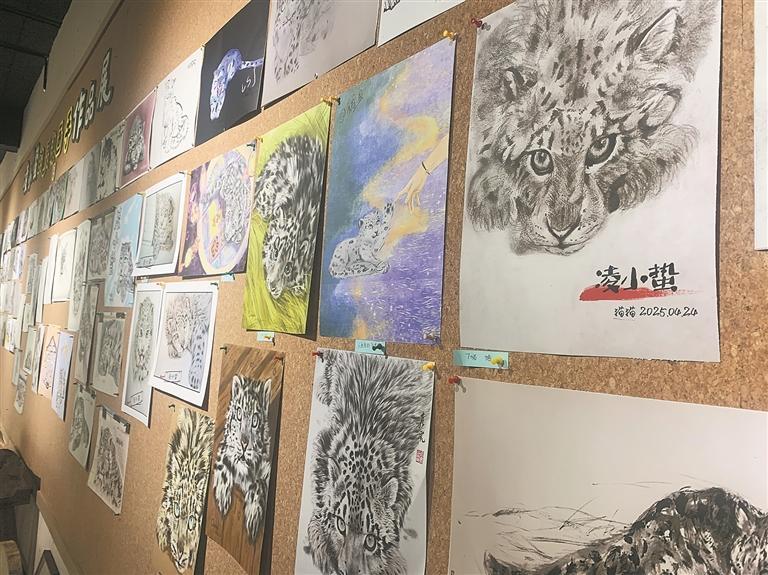 获救时蜷缩的身影、被工作人员抱起时的乖巧模样、恢复活力时腾跃的瞬间,在西宁野生动物园2323高原生灵实验室二楼的展示墙上,120余幅以“凌小蛰”为主人公的绘画作品被陈列展出。