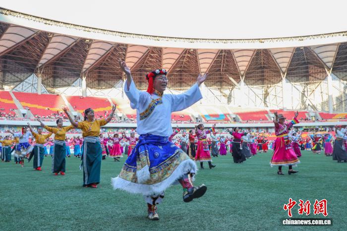 图为比赛前的藏族舞蹈表演。中新社记者 马铭言 摄