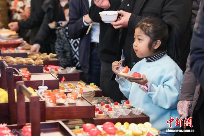 11月15日晚,青海祁连,小朋友品尝特色美食。当日,“青海家宴”流水席开席迎客,百余道融合国际风味与本土特色的精品菜肴供民众免费品尝。“青海家宴”缘起于青海——香港经贸交流合作活动,旨在打造具有青海本土文化底蕴的餐饮美食,创建以美食为媒、产供销对接、多业态融合发展的新模式。中新社记者马铭言 摄
