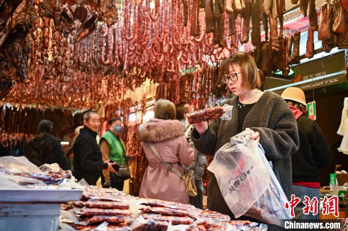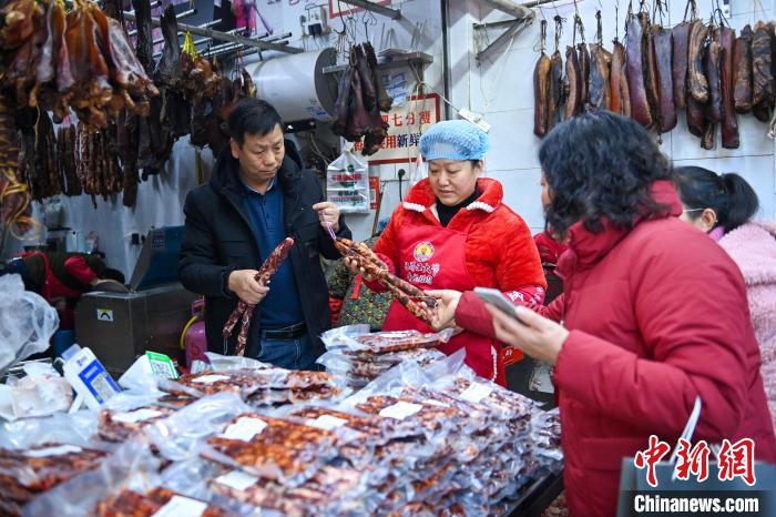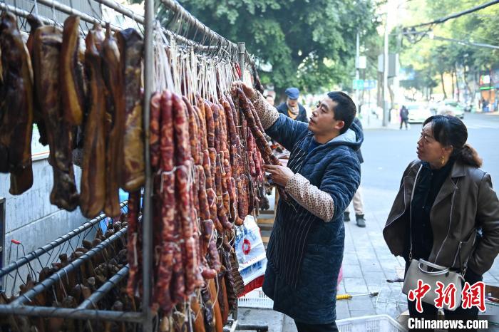 1月5日,四川成都,民众在新开寺街挑选香肠、腊肉。被称为“腊肉香肠一条街”的四川省成都市青羊区新开寺街,短短几十米的街道两侧店铺门口挂满了香肠或腊肉,店家忙着切肉或灌制香肠,民众忙着选购,年味渐浓。中新社记者刘忠俊 摄