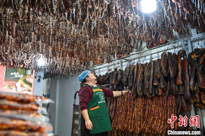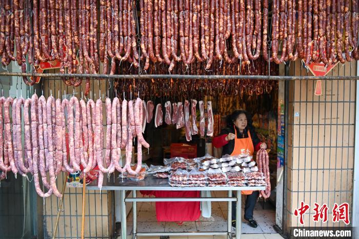 1月5日,四川成都,新开寺街一店铺内挂满了香肠、腊肉。被称为“腊肉香肠一条街”的四川省成都市青羊区新开寺街,短短几十米的街道两侧店铺门口挂满了香肠或腊肉,店家忙着切肉或灌制香肠,民众忙着选购,年味渐浓。中新社记者刘忠俊 摄