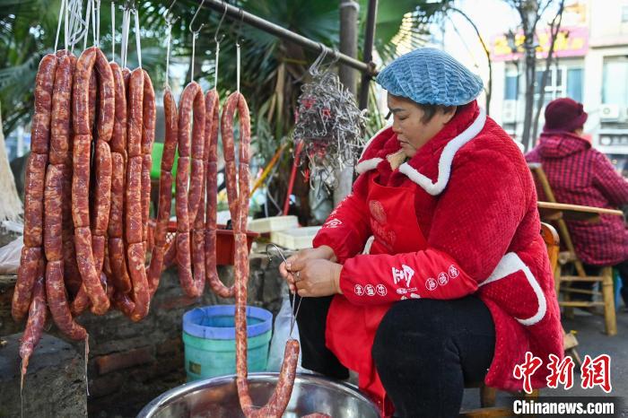 1月5日,四川成都,新开寺街边一师傅整理刚灌好的香肠。被称为“腊肉香肠一条街”的四川省成都市青羊区新开寺街,短短几十米的街道两侧店铺门口挂满了香肠或腊肉,店家忙着切肉或灌制香肠,民众忙着选购,年味渐浓。中新社记者刘忠俊 摄