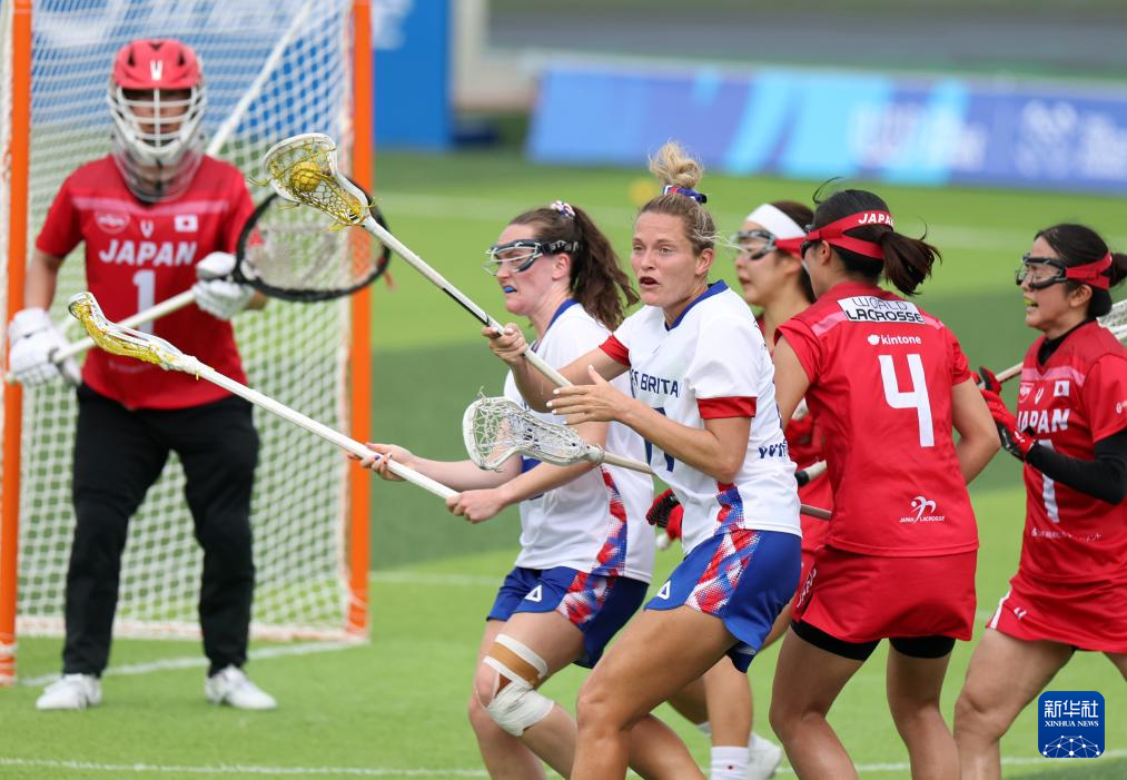 当日,在四川省成都市成都七中东部学校田径场举行的2025年成都世运会女子棍网球预赛A组比赛中,日本队15比10战胜英国队。