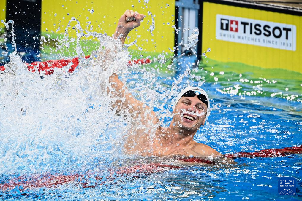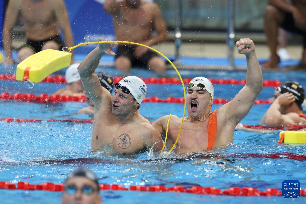 8月9日,法国队选手拉塞尔在比赛后庆祝。最终,法国队夺得冠军并创造该项目新的世界纪录。