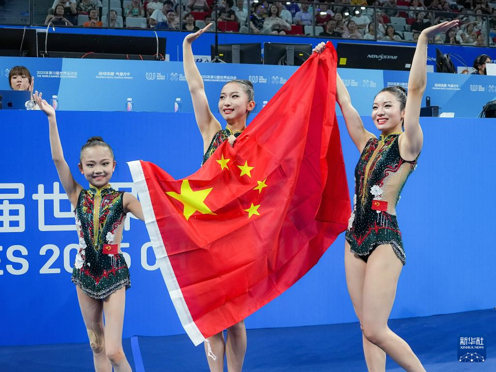 当日,2025年成都世运会技巧女子集体(女三)决赛举行,中国队获得冠军。