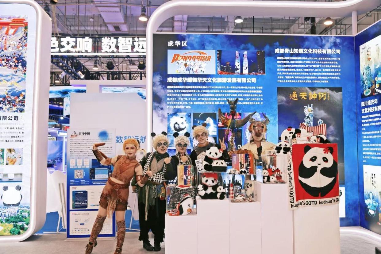 成华区展台则围绕“原创IP矩阵化”展开,形成了多维度的版权开发模式。成都蝶舞华天文化旅游发展有限公司针对原创IP《熊猫》音乐剧,设计了“线下演出+数字周边”的组合。现场虚拟角色数字藏品也都标注了专属版权标识,这些数字产品已经跟着音乐剧,在全国20多个城市和新加坡、马来西亚的巡演中同步售卖,让本土IP通过数字形式走向国际。同时,“熊猫勇士”IP已完成15项版权登记,还衍生出联名文具、潮玩手办等产品,覆盖不同消费场景,现场咨询的年轻参观者不少。成华区的成都青山知语文化科技有限公司则用“潮文悟”“玩聚方舟”两个品牌做差异化布局,和地方文博机构合作,把古蜀纹样做成笔记本、装饰画等实用文创,推出和潮流IP联名的卫衣、潮玩盲盒。