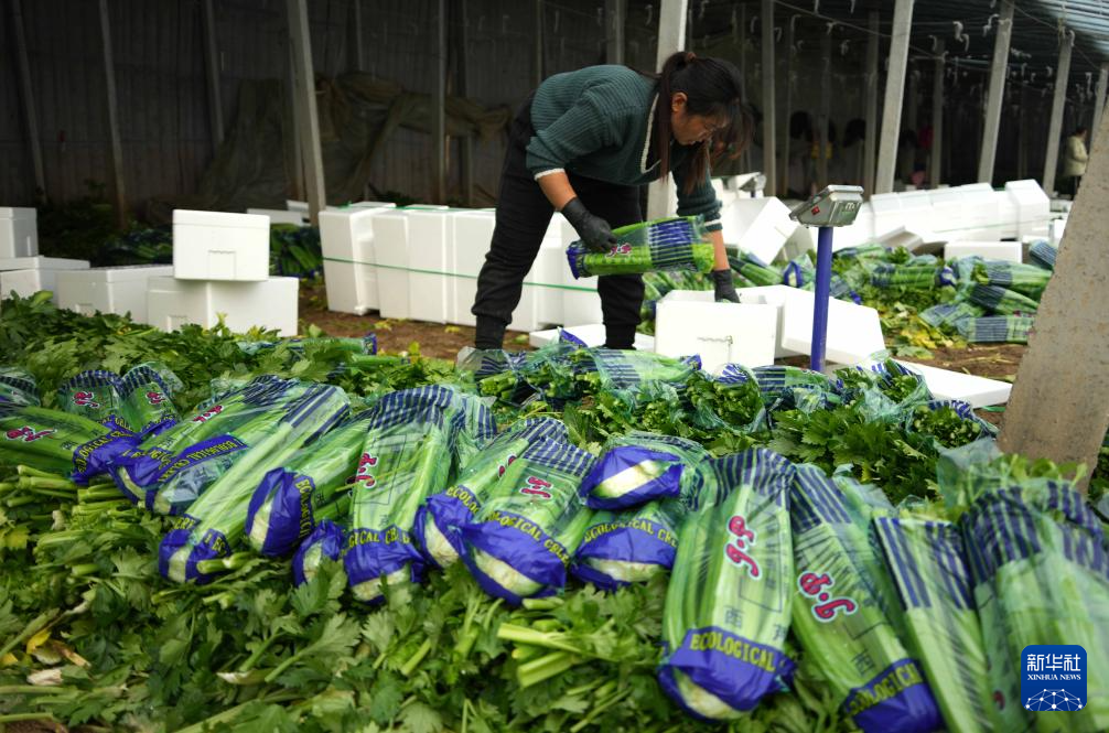 1月2日,农户在菏泽市定陶区一大棚内把刚收获的西芹装箱。