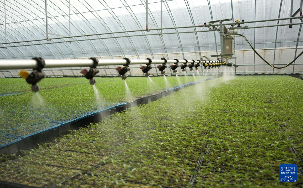 菏泽市定陶区一大棚内的自动化设备对蔬菜秧苗进行喷灌(1月2日摄)。