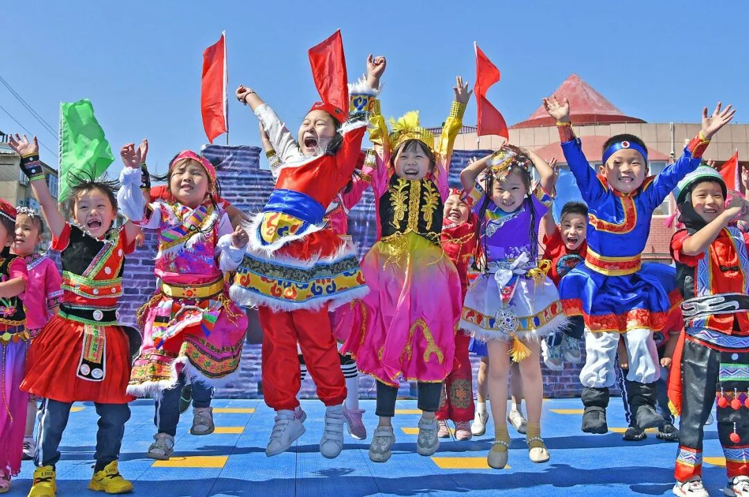 在山东省人大民侨外委的大力推动下,我省深入开展民族团结融合发展工作。图为烟台市某幼儿园小朋友身穿各族盛装,参加国庆活动,从小培养中华民族共同体意识。(孙文潭/摄)