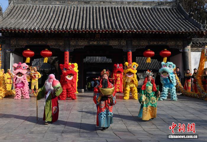 孔府门前的舞狮表演吸引观众观看。赵晓 摄