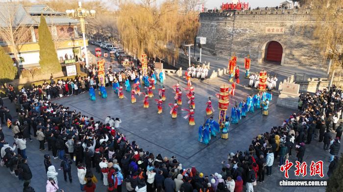 2月9日,山东曲阜,晨钟开城仪式举行,乐舞迎宾。当天,2026年“孔府过大年·骐骥驰骋年”活动启动,各类民俗体验和表演亮相。据了解,孔府,又称“衍圣公府”,是孔子嫡裔长支世代居住的官衙和府邸,有“天下第一家”的美誉,传承着规模盛大的春节礼仪。(无人机照片)王峰摄