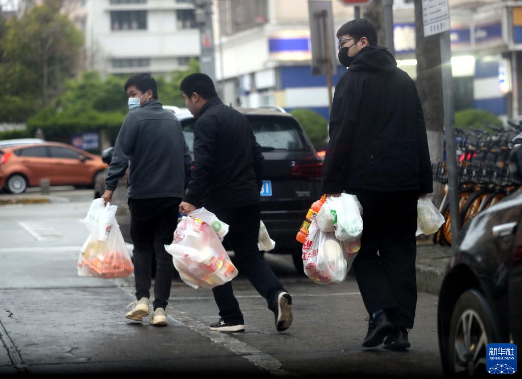 3月31日,在上海市闵行区的街道上拍摄的从超市走出的市民。