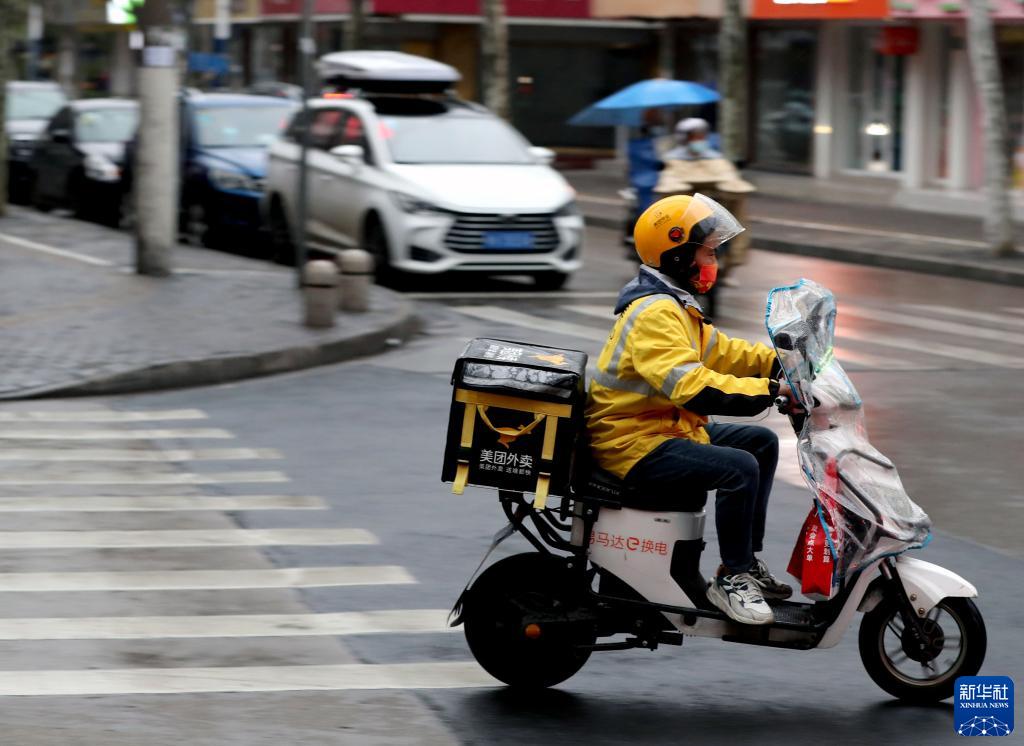 3月31日,在上海市闵行区的街道上,一名外卖员在送外卖。