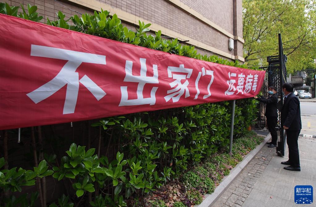 3月31日,上海市闵行区虹桥镇某小区的物业人员在悬挂宣传语。