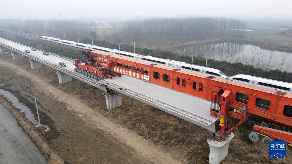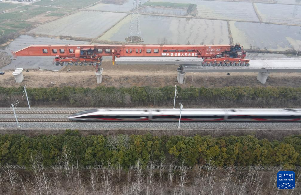 这是新建沪宁合高铁箱梁架设现场(2月23日摄,无人机照片)。