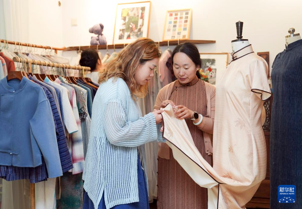 4月28日,王颖(右)给顾客介绍旗袍的工艺细节。