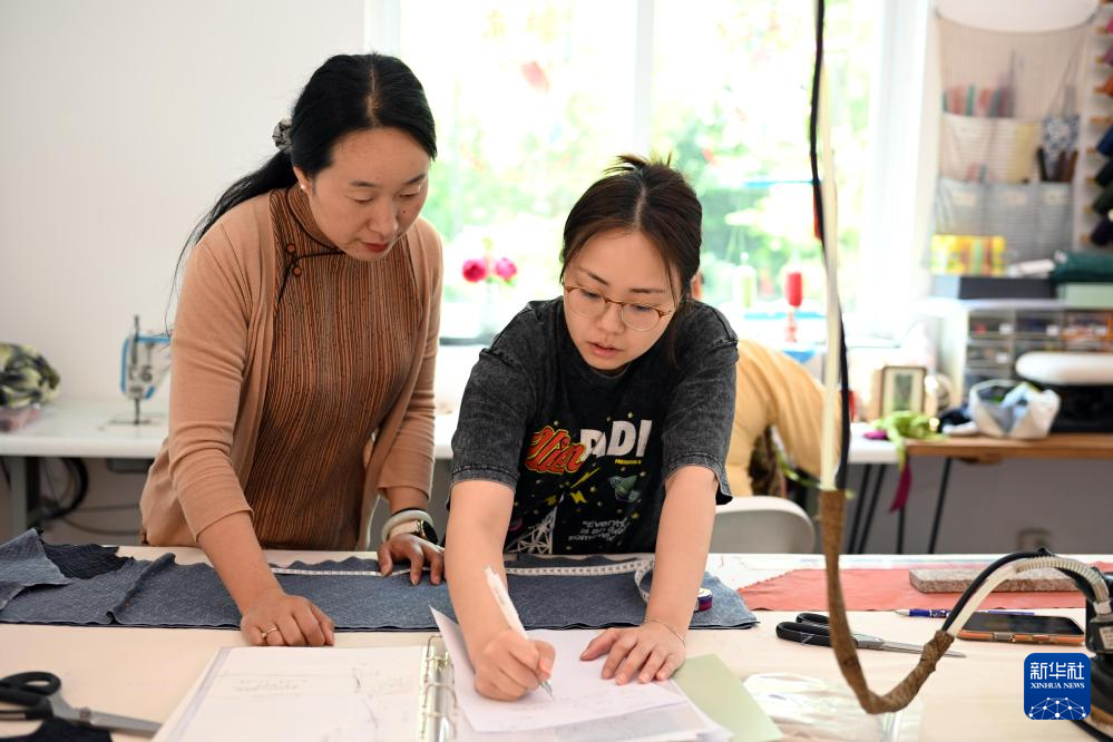 4月28日,王颖(左)在心禾裁云旗袍工作室给学生上课。