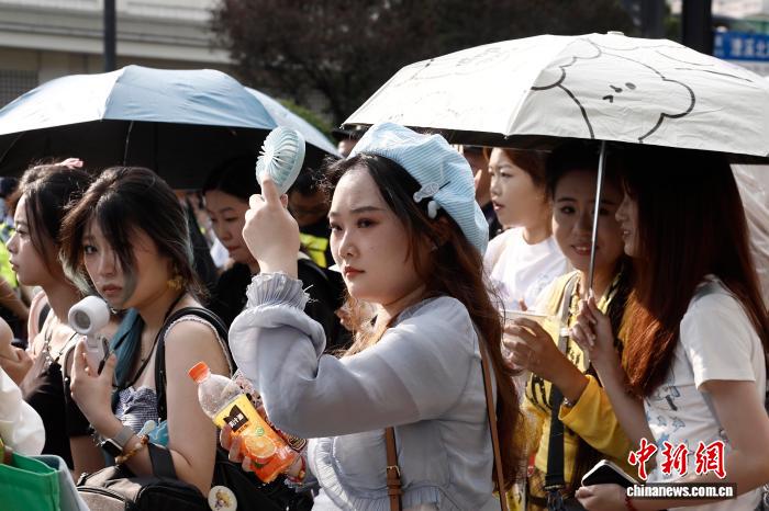 8月24日,游客一边贴着冰宝贴、一边用扇子遮阳行走在漕溪北路街头。中新社记者 殷立勤 摄