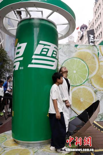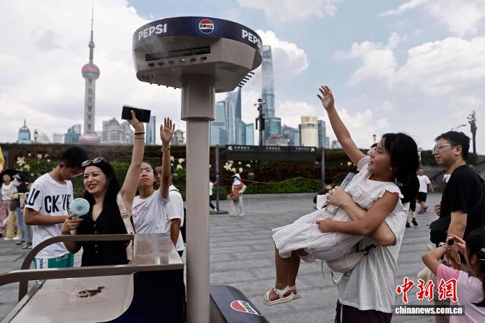 8月24日,游客在南京东路步行街上的喷雾降温装置下避暑。中新社记者 殷立勤 摄