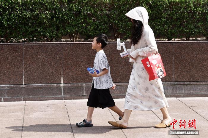 8月24日,在南京东路步行街上,家长手持电风扇给孩子降温。中新社记者 殷立勤 摄