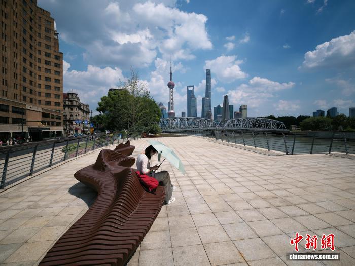 8月24日,游客打着遮阳伞在北苏州路上休息。中新社记者 殷立勤摄