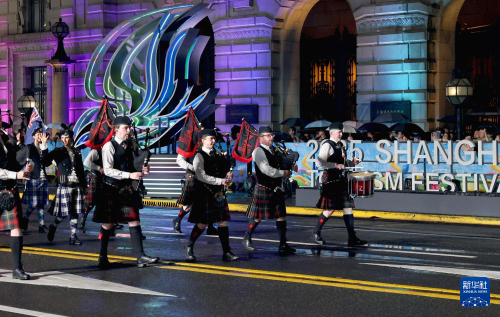 9月13日,澳大利亚墨尔本高地风笛乐队在上海旅游节花车巡游活动上表演。