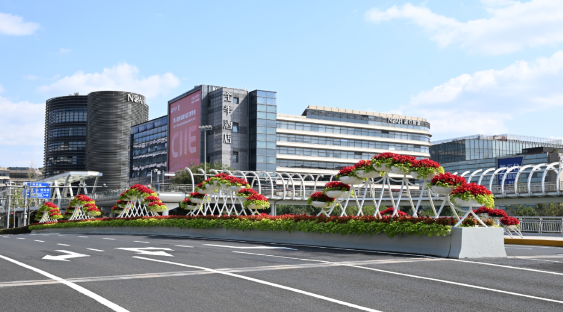 连通虹桥国际中央商务区与进博会主场馆的二层步廊,是参展宾客的重要通道之一,精心布置的花箱、草花,烘托出热情洋溢的迎宾氛围。位于嘉闵高架建虹路下匝口的“一带一路”“大进宝”用一抹嫣红迎接进博客商;虹许路虹桥路口的“花珠汇海”以及不远处的“虹桥之眼”喜迎各方嘉宾;处在小陆家嘴环岛中心的“开放之门”向世界诉说着改革开放的上海故事。“申字形”高架打造的“空中花廊”生机盎然,三角梅、亮金女贞、六道木等花卉通过科学养护与花期调控,确保进博会期间保持最佳观赏状态。上海全市170条主要道路干净整洁,60个景观区域美观宜人,黄浦江、苏州河清波荡漾,全方位展现上海的城市环境品质。