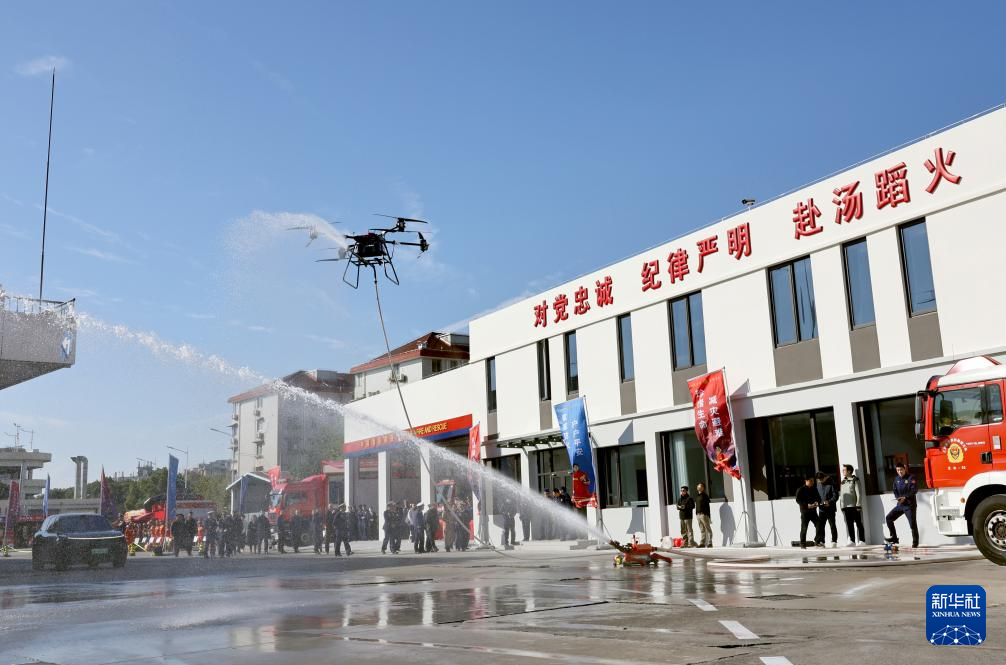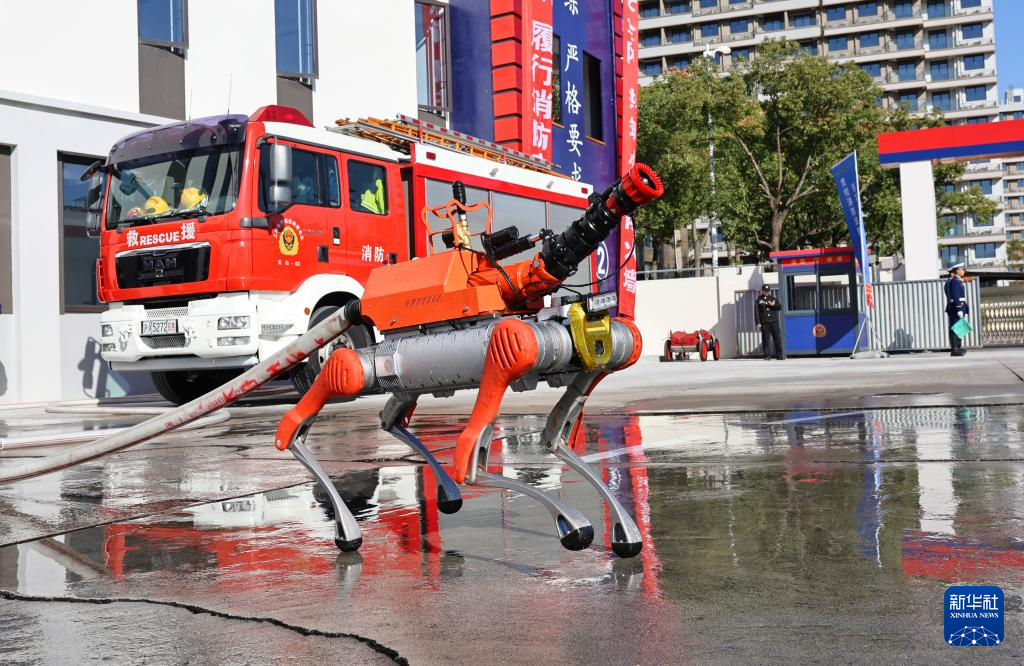 11月18日,消防无人机和高压水炮机器狗在活动现场进行作业演示。