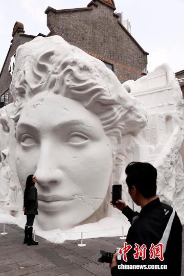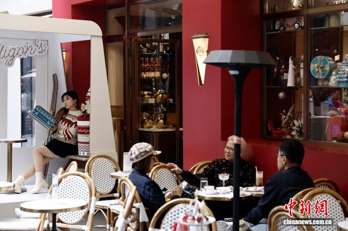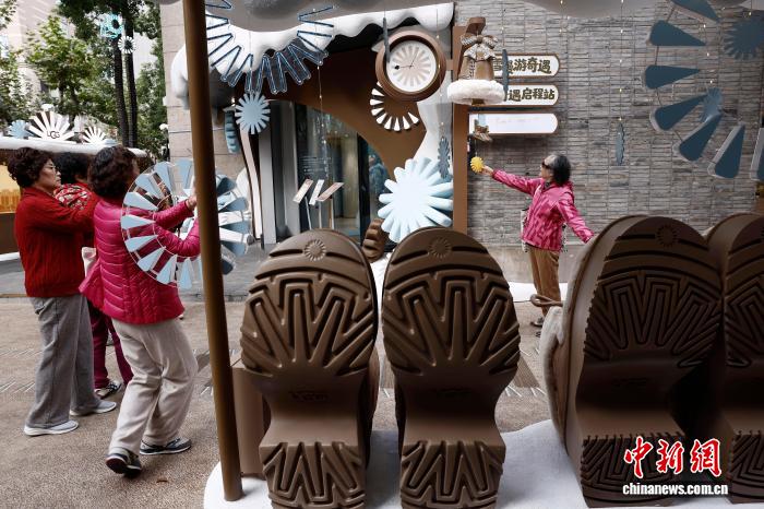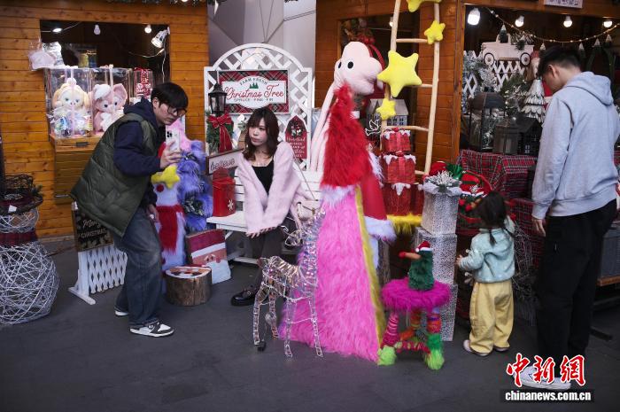 12月1日,游客在上海新天地商铺门口与冬日主题装饰合影。中新社记者 殷立勤 摄