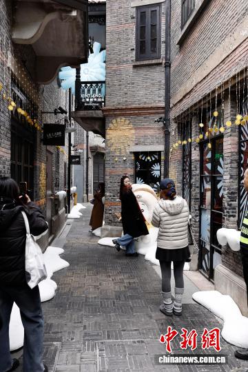 12月1日,游客在上海新天地弄堂内与冬日主题装饰合影。中新社记者 殷立勤 摄