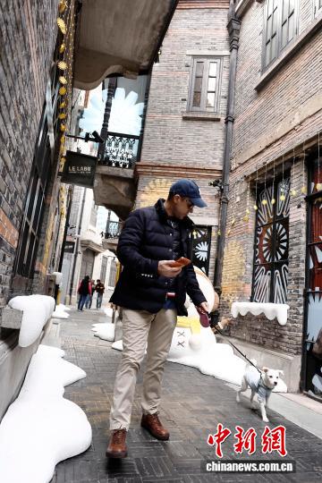 12月1日,游客带着宠物穿行在上海新天地弄堂内。中新社记者殷立勤 摄