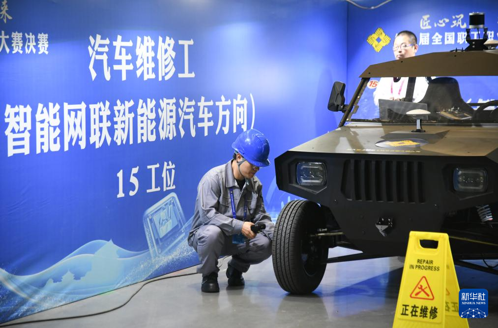 9月11日,选手在位于西安国际会展中心的比赛场地参加汽车维修工(智能网联新能源汽车方向)工种比赛。